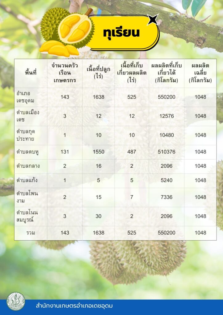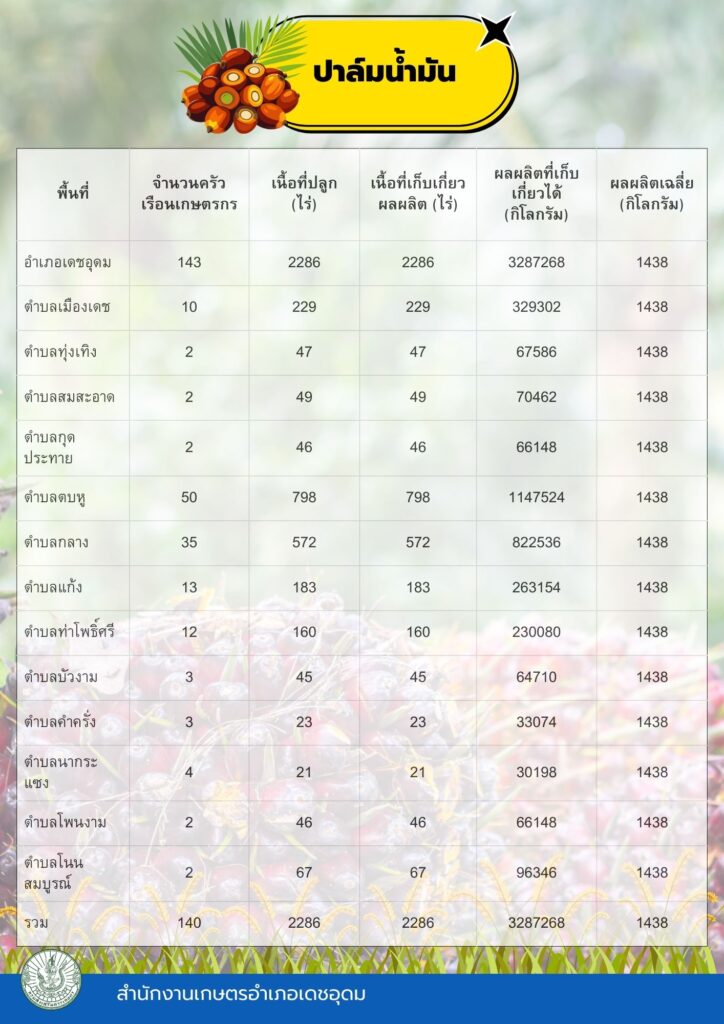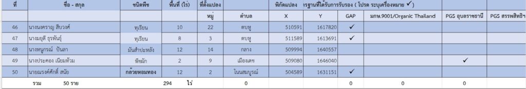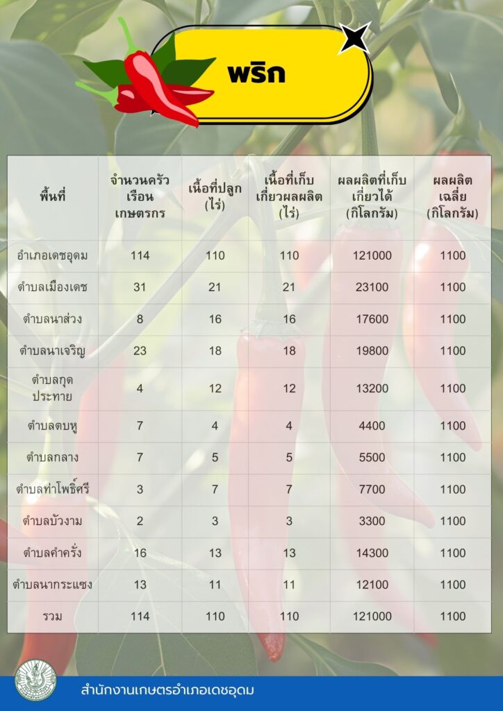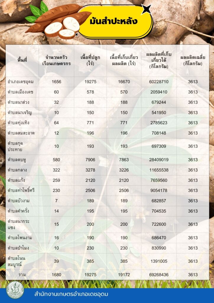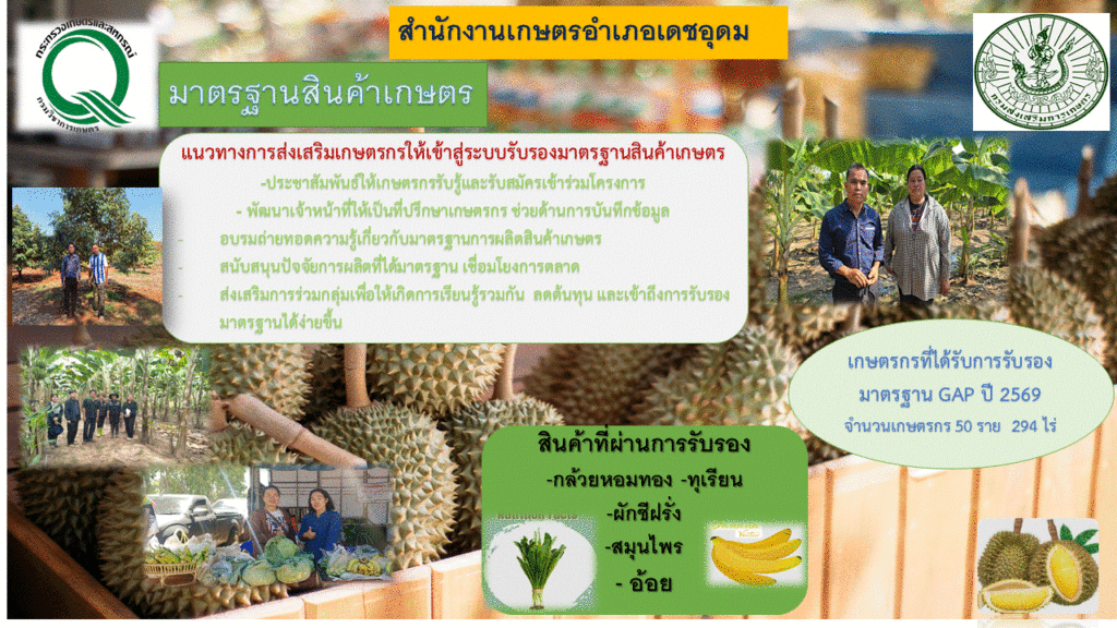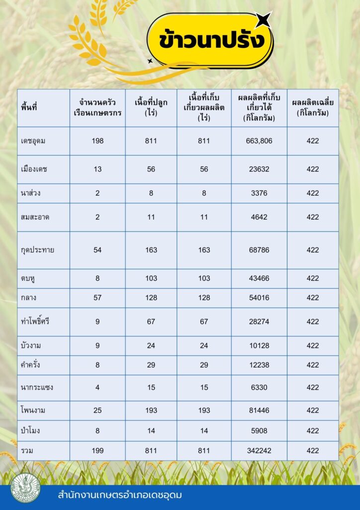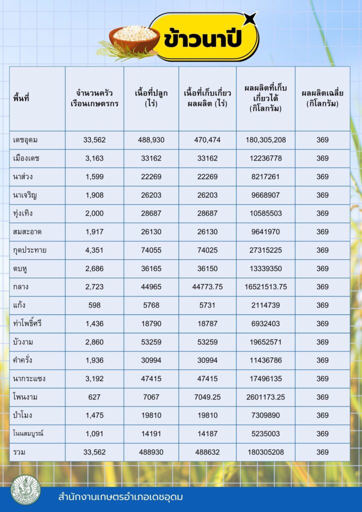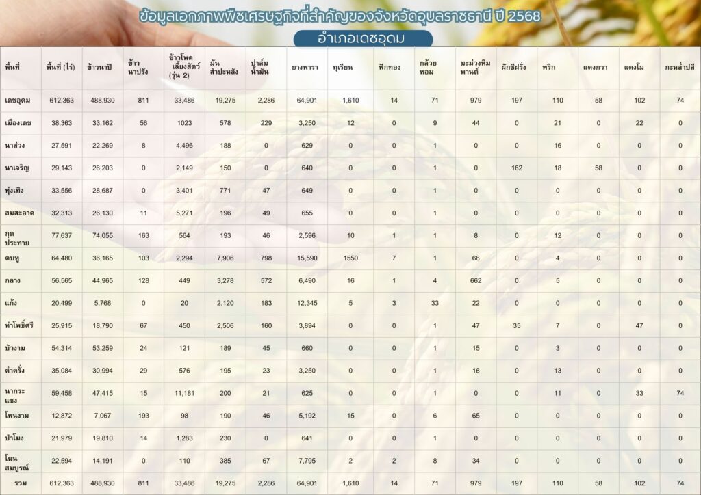ข้อมูลพื้นฐานทางเศรษฐกิจ ข้อมูลเอกภาพพืชเศรษฐกิจที่สำคัญของอำเภอเดชอุดม ระดับอำเภอ ข้อมูลเอกภาพพืชเศรษฐกิจที่สำคัญของอำเภอเดชอุดม ระดับตำบล ข้อมูลเกษตรกรที่ได้รับรองมาตรฐานที่มีในปัจจุบัน ระดับอำเภอ ประจำปี 2569 มาตรฐานสินค้าเกษตรกร