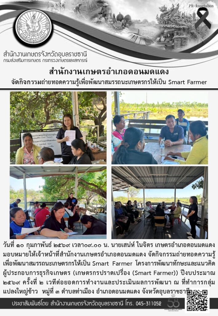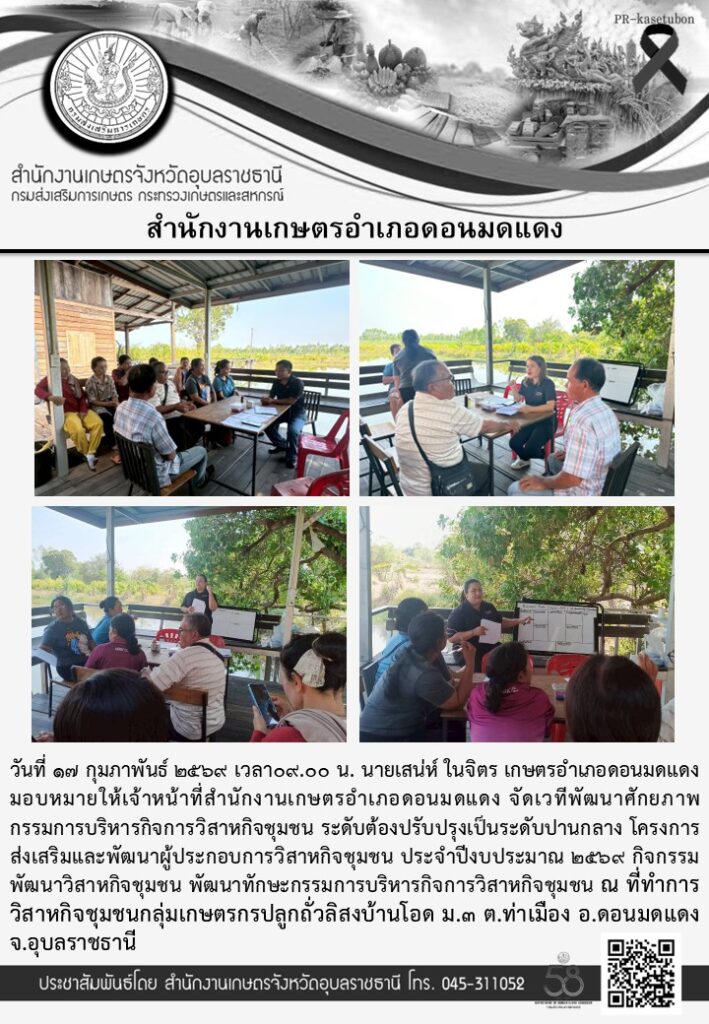 จัดเวทีพัฒนาศักยภาพกรรมการบริหารกิจการวิสาหกิจชุมชนอ่านเพิ่มเติมจัดกิจกรรมถ่ายทอดความรู้เพื่อพัฒนาสมรรถนะเกษตรกรให้เป็น Smart Farmerอ่านเพิ่มเติมจัดกิจกรรมการถ่ายทอดความรู้ให้แก่เกษตรกร โครงการระบบส่งเสริมการเกษตรแบบแปลงใหญ่อ่านเพิ่มเติมจัดกระบวนการเรียนรู้ โครงการศูนย์เรียนรู้การเพิ่มประสิทธิภาพการผลิตสินค้าเกษตร กิจกรรม เสริมสร้างศักยภาพเกษตรกรผู้นำอ่านเพิ่มเติม