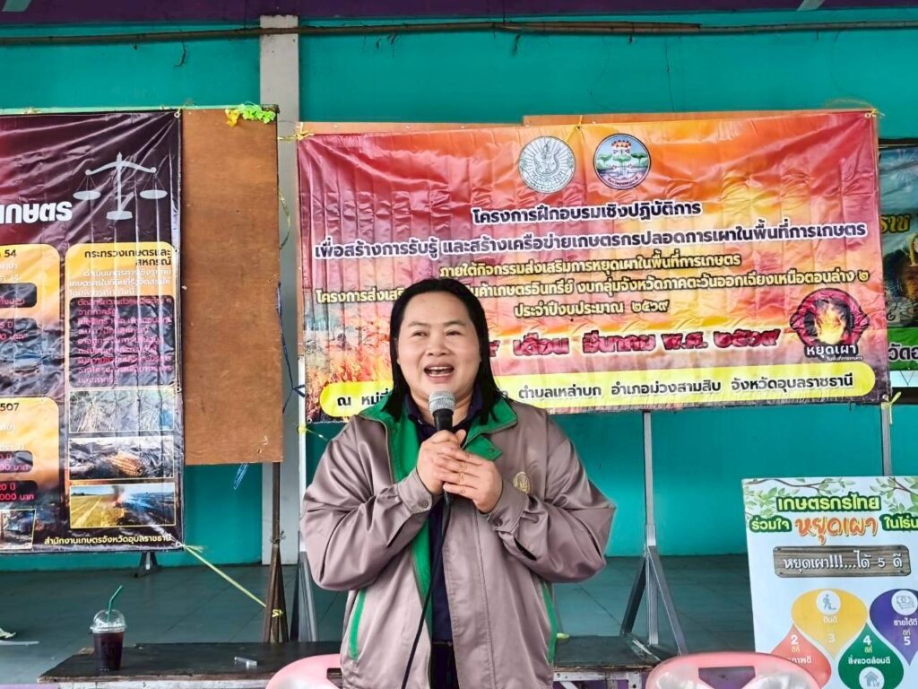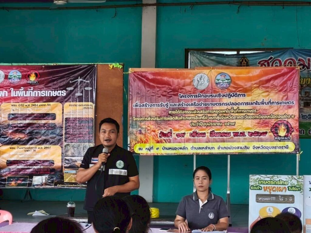 ทั้งนี้ การฝึกอบรมดังกล่าวมีเกษตรกรเป้าหมายเข้าร่วมจำนวน 50 ราย ณ ศาลากลางบ้านหนองหลัก หมู่ที่ 9 ตำบลเหล่าบก อำเภอม่วงสามสิบ จังหวัดอุบลราชธานี โดยมีวัตถุประสงค์เพื่อส่งเสริมให้เกษตรกรลดการเผาในพื้นที่การเกษตร อันจะช่วยลดปัญหามลพิษทางอากาศ และสร้างเครือข่ายเกษตรกรที่เข้มแข็ง นำไปสู่การพัฒนาการเกษตรอย่างยั่งยืนต่อไป