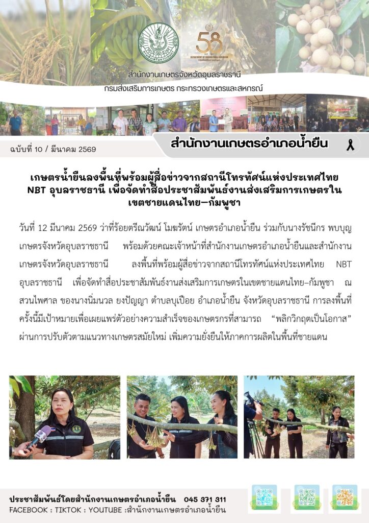 เกษตรน้ำยืน-ลงพื้นที่พร้อมผู้สื่อข่าวจากสถานีโทรทัศน์แห่งประเทศไทย NBT อุบลราชธานี เพื่อจัดทำสื่อประชาสัมพันธ์งานส่งเสริมการเกษตรในเขตชายแดนไทย–กัมพูชาBy สำนักงานเกษตรอำเภอน้ำยืน / 16 มีนาคม 2026