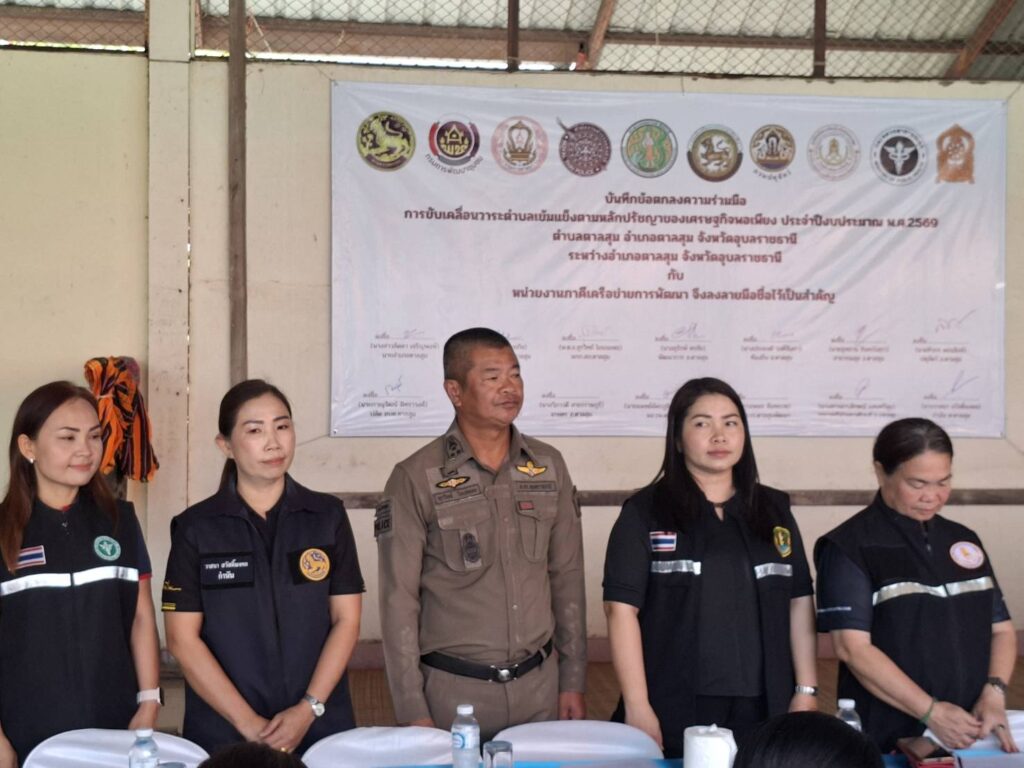 วันที่ 26 กุมภาพันธ์ 2569 เวลา 10.00 น. สำนักงานเกษตรอำเภอตาลสุม เดินหน้าบูรณาการความร่วมมือเพื่อการพัฒนาชุมชนภาคการเกษตรอย่างยั่งยืน โดย นางวิภาวดี สาธรราษฎร์ เกษตรอำเภอตาลสุม ได้มอบหมายให้ นางสาวจิราพรรณ ไชยพงษ์ นักวิชาการส่งเสริมการเกษตรปฏิบัติการ เป็นผู้แทนหน่วยงาน เข้าร่วมกิจกรรมและพิธีลงนามบันทึกข้อตกลงความร่วมมือ (MOU) การขับเคลื่อนวาระ “ตำบลเข้มแข็งตามหลักปรัชญาของเศรษฐกิจพอเพียง” ประจำปีงบประมาณ พ.ศ. 2569 ณ วัดบ้านแก่งกบ ตำบลตาลสุม อำเภอตาลสุม จังหวัดอุบลราชธานี